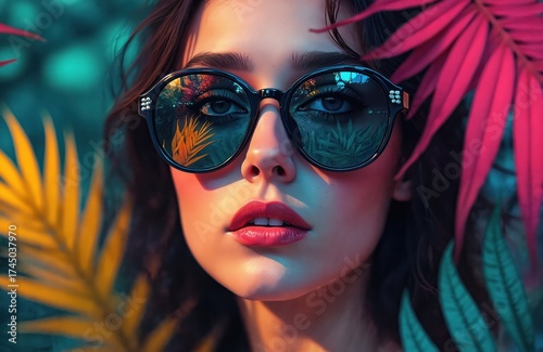 Woman wears sunglasses reflecting tropical plants and foliage. Vibrant pink and yellow leaves surround her face in this surreal jungle portrait.