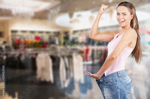 woman, weight, loss, large, blue, isolated, shape, beautiful, holding, girl, female, beauty, success, caucasian, health, healthy, diet, care, nourishment, hand, big, concept, figure, measure, measurement, body, belly, dieting, fit, fitness, pant, stomach, waist, achievement, lady, clothes, jean, loose, size, calorie, losing, slim, waistline, thin, lost, physical exercise, slimming, weight loss