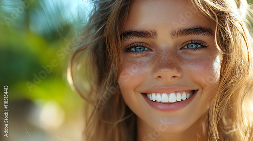 woman with a beautiful and confident smile showcasing her radiant white teeth, ideal for dental services marketing and teeth whitening promotions