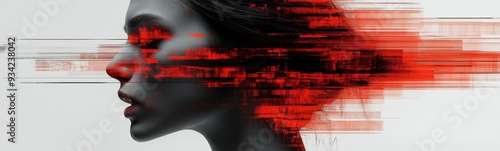Woman with a red face and a red background, creative portrait, banner, copy space