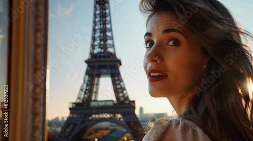woman with amazed expression looking at the Eiffel Tower from the window. His eyes shone with admiration as he looked at the famous landmark. Ai generated Images