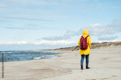 adventure, backpack, backpacker, bag, beach, calm, calmness, hiking, holiday, horizontal, jacket, journey, landscape, leisure, lifestyle, baggage, nature, ocean, outdoors, peaceful, person, recreation, sand, sea, shore, sightseeing, tour tourism, holiday maker, travel, traveler, trip, unrecognizable, vacation, view, walking, water, yellow, copy space, backview, caucasian, white, woman, girl, female, people, adult, adult, 20s, grown-up