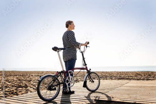 woman, bicycle, footpath, beach, clear sky, cycling, exercising, transportation, freedom, fitness, hobby, healthy lifestyle, standing, nature, contemplation, looking away, aging process, senior, sunlight, sea, bodycare, remote, beauty, tranquil scene, calmness, water, copy space, striped, well-being, shadow, retirement, full-length, avocation, lifestyle, sunny, casual clothes, mature woman, outdoors, day, one person, baby boomer, female, mature adult