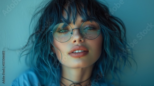 woman, blue, hair, round, goggles, portrait, closeup, camera, smile, messy, bob, bang, make-up, skin, clear, background, calm, serenity, fashion, coiffure, beauty, eye, green, model, female, portraiture, head shot, studio, photoshoot, style, trend, expression, look, gaze, stylish, trendy, girl, glamour, young, pretty, beautiful, attractive, chic, cool, hairstylist, haircut, hairdresser, colours, dye