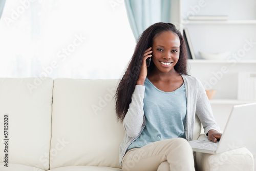 20s, young adult, woman, female, black, call, calling, mobile phone, mobile phone, communicate, communication, computer, connection, connectivity, conversation, couch, home, indoor, interior, cyberspace, laptop, leisure, mobile, mobility, modern, notebook, phone, sitting, sofa, talk, technology, wireless, cellular, smile, talking, phone, living room, mobile phone, phone call