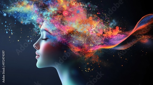 woman, hair, face, colourful, art, digital, fantasy, abstract, portrait, model, eye, closed, profile, imagination, dreamy, creative, inspiration, artistic, style, beauty, fashion, head, peace, colours, bright, light, sparkle, texture, design, vibrant, glow, galaxy, paint, high-coloured, hallucinogen, expression, female, blue, purple, green, red, yellow, orange, pink