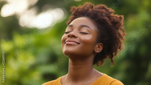 woman, relaxation, lifestyle, curly hair, nature, smile, model, young, confident, trendy, make-up, female, skincare, beautiful, facial, lady, pretty, peace, happiness, green, joy, portrait, african american, beauty, sunlight, calm, serene, emotion, carefree, summer, closeup, expression, calmness, positive, wellness, health, natural, environment, bliss, mindfulness, contentment, youth, vibrant, fresh