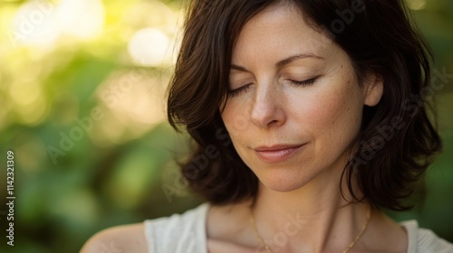 woman, eyes closed, outdoors, portrait, person, female, meditation, relaxation, calm, peaceful, serene, tranquil, daytime, natural light, nature, brunette, short hair, white shirt, necklace, closeup, face, skin, profile, head shot, sharpened, soft focus