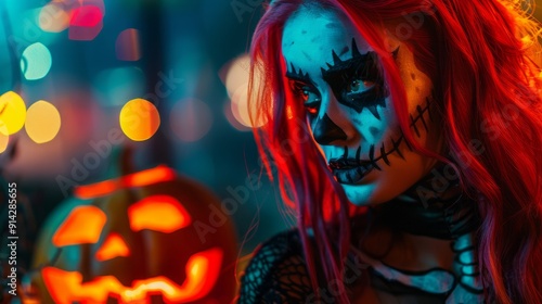 Woman with face paint and a Halloween pumpkin
