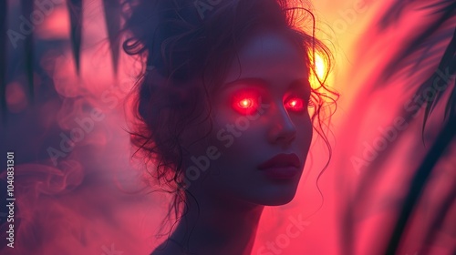 Woman with Glowing Red Eyes in a Dreamy, Mystical Setting
