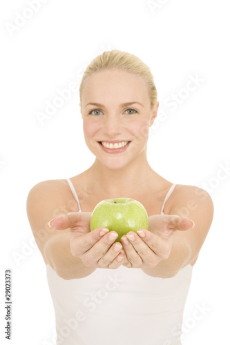 20s, adult, aliment, apple, beauty, beverage, blonde hair, blond, blue eye, caucasian, food, fresh fruit, fruit, green apple, hand, healthy eating, holding, indoor, interior, isolated, laugh, looking, people, portrait, smile, top, white background, woman, young, young people, missy