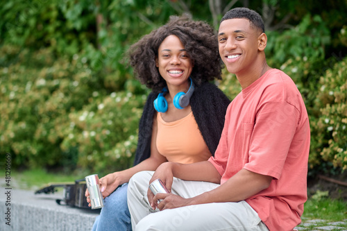 waist up, two people, man, woman, african american, young, adult, outdoors, rest, earphones, casual attire, attractive, interest, positive, generation, optimistic, day, free time, walk, couple, happy, good mood, pleasure, cheerful, well-being, smile, weekend, sitting, human relationships, creative, musician, nature, drink, leisure