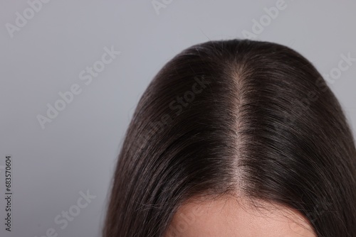 Woman with healthy hair on grey background, closeup. Space for text
