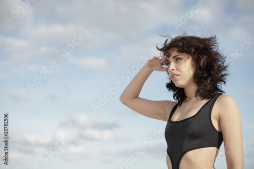 woman, blue, sky, hand, forehead, bikini, brunette, beauty, young, 20s