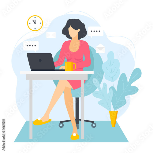 Woman with laptop sitting. Freelance or studying concept. girl works at a computer in a home interior. vector