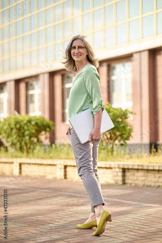 sight, turn, active, building, woman, casual attire, street, walking, pleasure, good mood, self employed, one person, good-looking, businesswoman, leisure, cheerful, outdoors, caucasian, emotion, lifestyle, pleasant, pastime, holding, park, freedom, ageing, happy, goggles, smiling, full-length, confidence, movement, mature, energy, retired, feminine, laptop, elegant