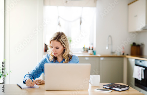 Woman with laptop working at home, taking notes