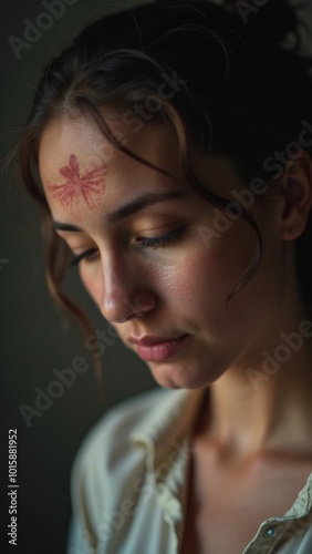 Woman with Leaf Tattoo on Forehead Looking Down in Thoughtful Pose