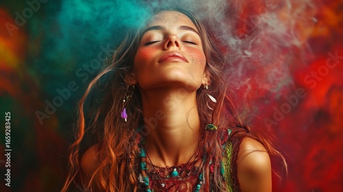 Woman with long hair in colorful smoke. Peaceful expression, colorful background.