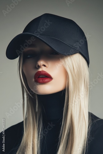 Woman with Long Hair Wearing Black Cap and Bold Red Lips Portrait