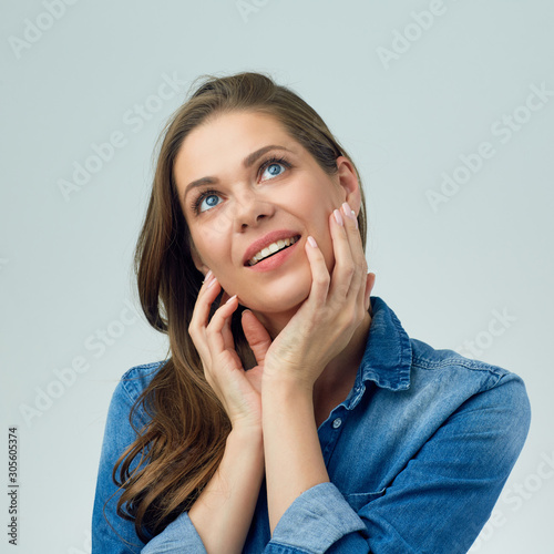 woman, smile, happy, isolated, female, young, girl, casual attire, positive, student, fashion, background, portrait, adult, pretty, person, attractive, people, long hair, beauty, blue shirt, blue, caucasian, youth, style, white, hair, studio, 1, model, hand