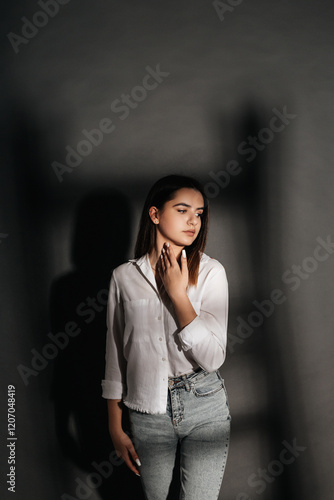 1, person, pant, white shirt, graceful, youth, chic, outfit, trendy, look, charming, black pants, wear, sit, relax, lovely, body, fashion, blue, shirt, young, style, background, girl, attractive, female, model, white, beautiful, beauty, studio, posing, gorgeous, white background, student, woman, portrait, jean, adult, lady, pursed, face, elegance, clothes, vogue, trousers
