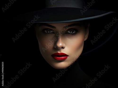 Woman with make-up and red lipstick wearing a black hat fashion portrait