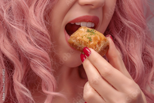 sugar, dessert, joy, enjoy, pink, happy, sweet, food, baklava, person, face, expression, female, diet, snack, young, woman, healthy, pistachio, concept, turkish, turkey, traditional, delicious, white, pasty, disgust, junk, emotion, meal, grimace, stink, shocked, eating