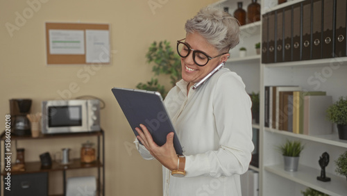 Woman with short hair and glasses holding tablet and balancing smartphone at shoulder in office with shelves and plant; happiness.