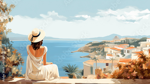 woman, sitting, mediterranean, travel, holiday, destination, vacation, sea, enjoy, relaxation, looking, female, girl, lifestyle, city, landscape, summer, view, europa, person, calmness, trip, dress, popular, touristic, attraction, adventure, leisure, illustration, coast, italy, greece, croatia, spain, france, tunisia, turkey