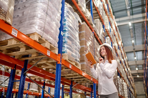 low angle, diversity, shelf, woman, inventory, young, confident, indoor, arrangement, industry, warehouse, storage, supervisor, waist up, owner, metal, ginger, helmet, elegant, tablet, aisle, accounting, container, caucasian, manage, packed, good, stack, successful, box, professional, protective, adult, long-haired, business, determined, inspection, style