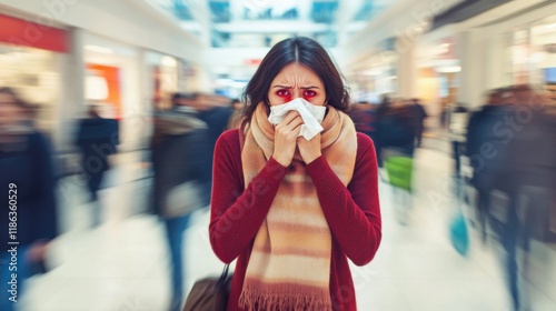 woman, sleepy, eye, red, blowing, nose, tissue, crowded, shopping, mall, motion, blur, indoor, emotion, winter, foulard, fashion, health, disease, expression, tied-up, people, panic, discomfort, hygiene, frustration, lifestyle, anxiety, portrait, sorrowful, congestion, flu, activity, retail, atmosphere, urban, empathy, scene, behaviour, distraction, crowd, struggle, respiratory, closeup, everyday, challenge, moment, facial