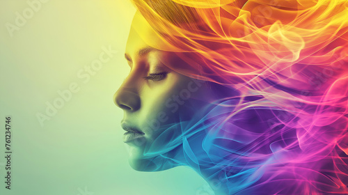 Woman with vibrant mind waves, abstract psychological concept. Colorful mental energy flowing from serene profile, introspection. Cortisol double exposure abstract image