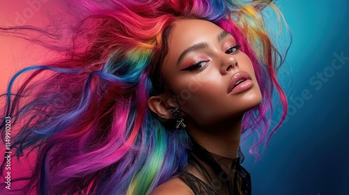 woman, hair, colourful, rainbow, vibrant, style, beauty, model, fashion, coiffure, make-up, wave, long, glossy, dynamic, movement, expression, pose, portrait, face, skin, eye, lip, jewellery, earring, dress, background, studio, photo, red, pink, purple, blue, green, yellow, orange, texture, shine, gorgeous, attractive, confident, elegant, trendy, stylish, modern