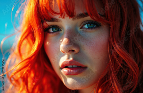 Woman with vibrant red hair and striking blue eyes looking directly at the camera