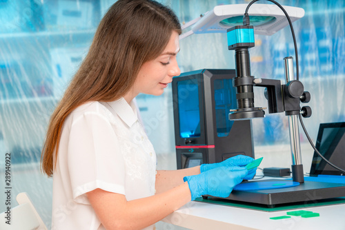 Woman worker in control of Resin LCD / DLP / SLA 3D Printer in technology lab