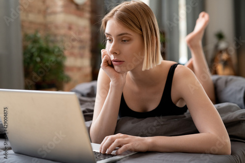 adult, beauty, bed, blonde hair, casual clothes, comfortable, computer, domestic life, electronic mail, home interior, indoor, cyberspace, laptop, avocation, lifestyle, living room, looking, lying down, pillow, relaxation, resting, sitting, smiling, sofa, technology, sleepy, wireless technology, woman, working, worried, young adult, missy