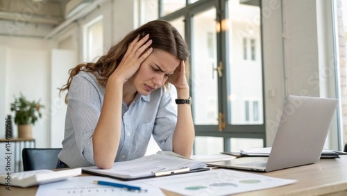 woman working in office has headache and holds her head