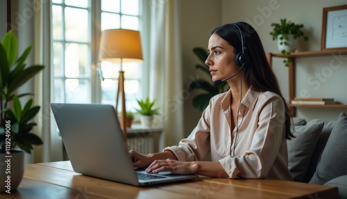 Woman Working Remotely with Headset in a Cozy Home Office Environment
