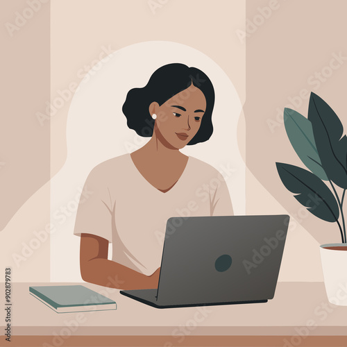 Woman works on computer, work from home, remote work, online, international women's day, March 8, professions, icon, art