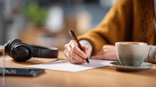 Woman writing at desk with coffee and headphones for study or work in a cafe or home setting