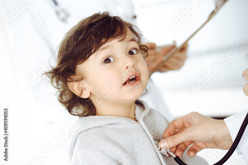 Woman-doctor examining a child patient by stethoscope. Cute arab toddler at physician appointment. Medicine concept
