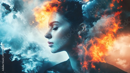 Woman's face merging with fiery and icy clouds, a surreal portrait.