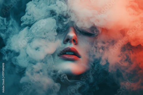 smoke, vapour, teal, orange, red, face, woman, lip, eye, closed, mysterious, enigmatic, sensual, dark, moody, shadowy, abstract, portrait, model, beauty, fashion, artistic, stylised, aethereal, dreamy, texture, colours, contrast, intense, captivating