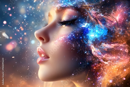Woman's Face Surrounded by Galaxy Nebula.