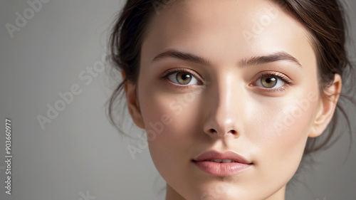 woman's face with beautiful, luminous skin. The soft, warm lighting highlights her flawless complexion