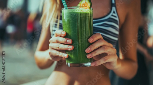 woman's hand elegantly holds a vibrant green smoothie, symbolizing health and vitality. The drink's freshness reflects a commitment to wellness and a balanced lifestyle, emphasizing nourishment