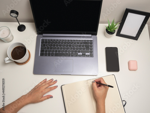 Woman's hands on a white table with a laptop typing on the keyboard next to a mobile phone a black notebook a cup of coffee a clock a white candle a small bush and a blank photo frame