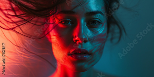 woman, girl, adult, attractive, female, person, photo, portrait, face, intense, gaze, dramatic, red, blue, light, contrast, windswept, hair, high-coloured, teal, powerful, mood, dynamic, expressive, bold, wind, glow, fierce, energy, artistic, depth, mystery, radiant, captivating, young, horizontal, format, wide, banner, background, appearance, caucasian, angle, white, professional, lady, single