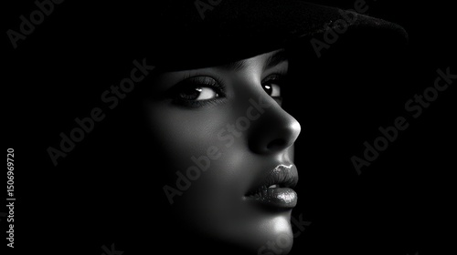 woman, profile, face, eye, lip, nose, black, white, monochrome, beauty, fashion, portrait, style, elegance, serious, intense, gaze, shadow, light, dark, contrast, detail, expression, confident, mysterious, captivating, allure, elegant, glamour, closeup, model, passionate, thoughtful, pensive, seriousness, intriguing, sensual, sophisticated, stylish, glamourous, portraiture, photo, greyscale, picture, photo, art, shadowy, high key